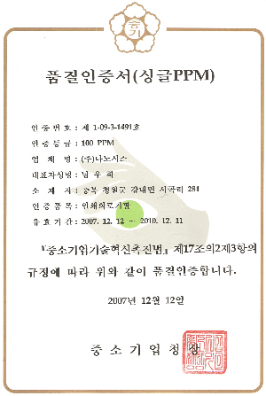 2007년 12월 당사는 중소기업청 주관 Single PPM 품질 인증을 획득하였읍니다.